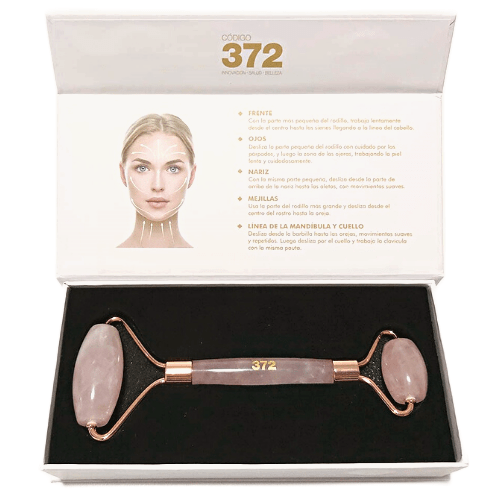 El rodillo facial de cuarzo rosa contiene minerales increíbles para la piel que ayudan a generar colágeno y elastina de forma natural.